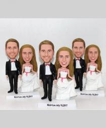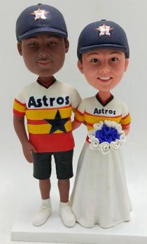 We offer Custom Cake topper for a few of years and we know more about bobblehead custom cake toppers than anyone. Over 150 styles are offered in this category. Most are best-selling and popular with customers. We have a lot of standard wedding cake toppers styles with bride wearing dress and groom in suit standing or sitting by each other, holding hands or groom carrying bride.Though more couples prefer to customize a stylish cake topper, a few of couples insist on buying standard bobbleheads to put on the cake. You can choose the one best suits your clothes you wear on your wedding day and add the accessories like flower, pets, ties,personalized bases and any other options. You can also select the one shows the right occupation of you or the hobby of you and that must be a meaningful option. Cake topper is really one of the most important part of the wedding. Everyone would like their bobblehead topper to become the hit of the day. And we will help you realize your wish. What you need to do is trust us and specify your requirement and we will do the rest.